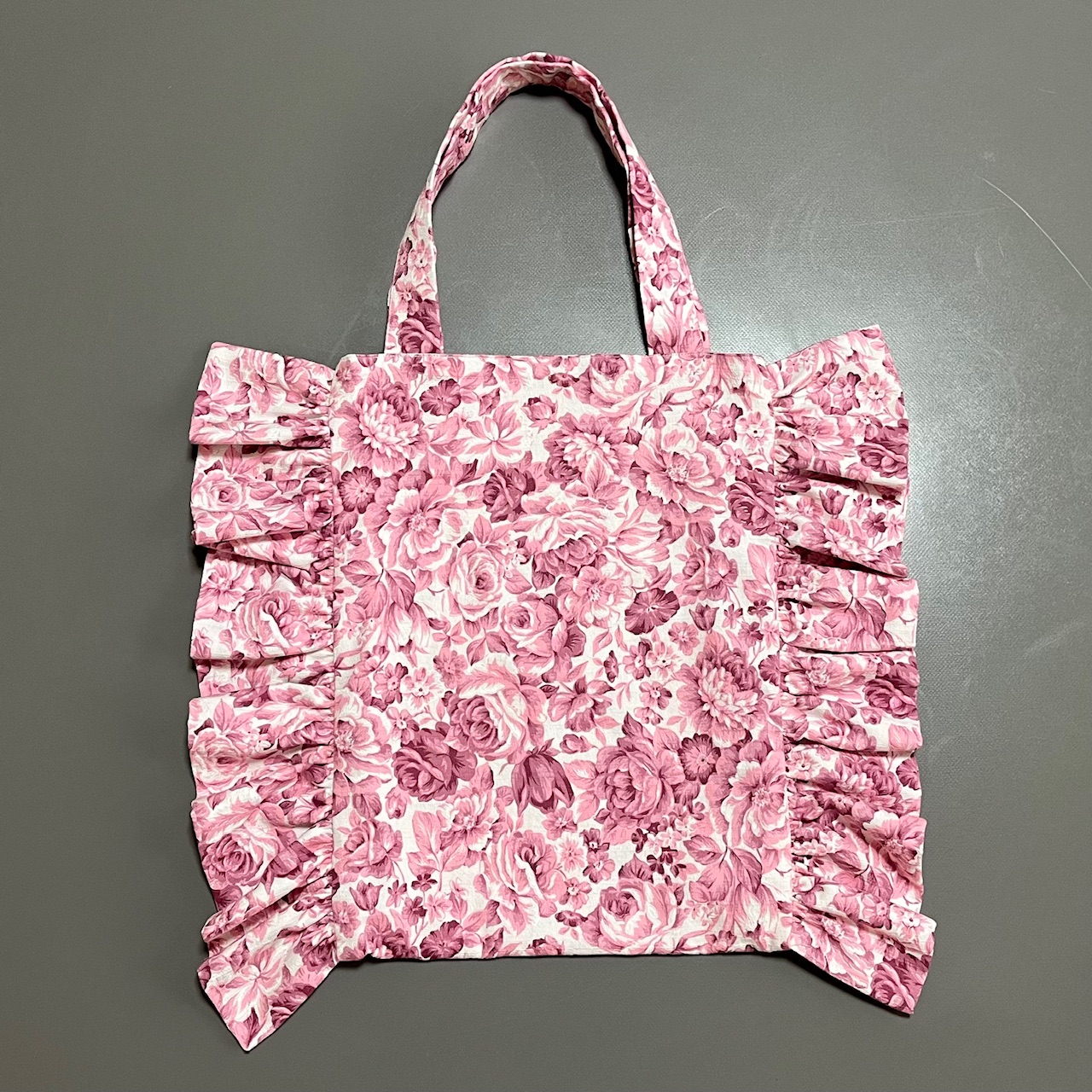 作ったトートバッグは、横に羽根?フリルが付いているので、実際の容量よりもかさばる、ちょっと大げさなバッグだけれども、その無駄さ?が可愛らしくて気に入ってます。